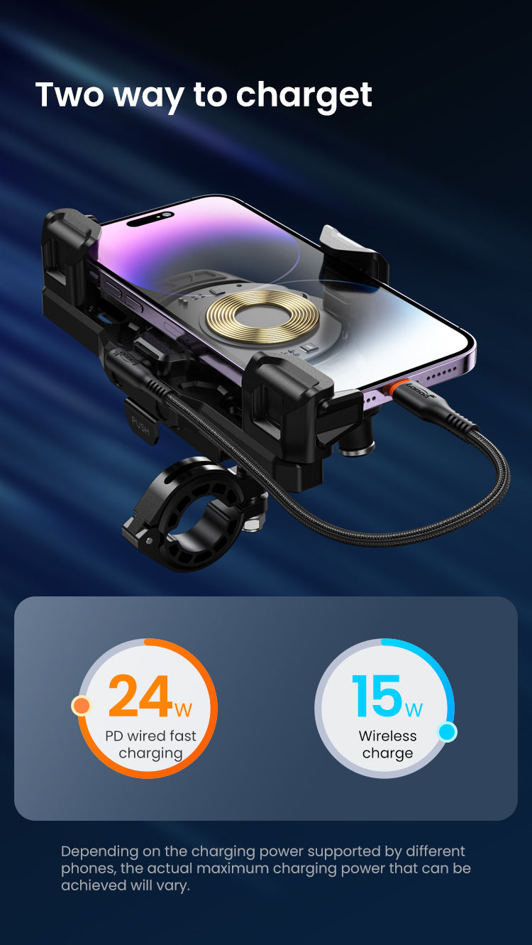 Securely mount your phone to handlebar, mirror or fork stem. Protect your phone with our Vibration Dampener. Charging options available.