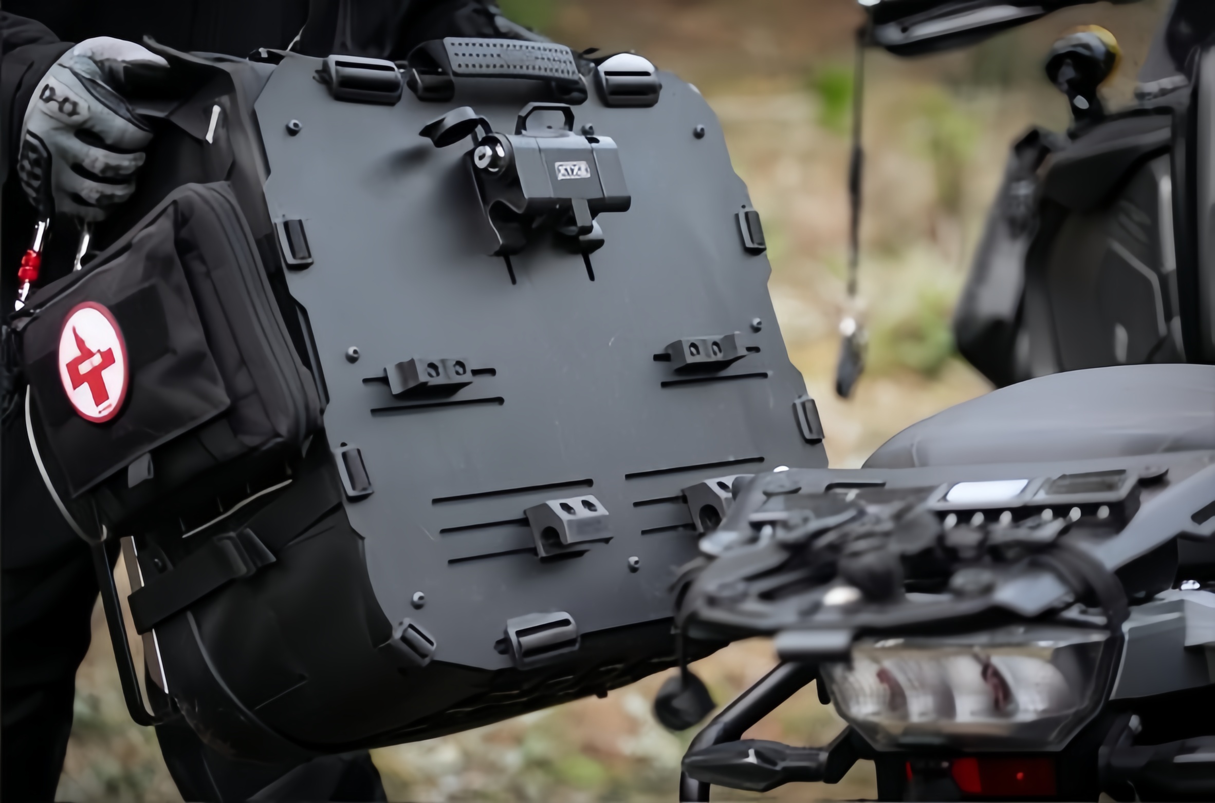 The sides and upper and lower surfaces of the saddlebags are equipped with a MOLLE fixing system, where you can install our small saddlebags, expansion bags or your own MOLLE-compatible equipment.