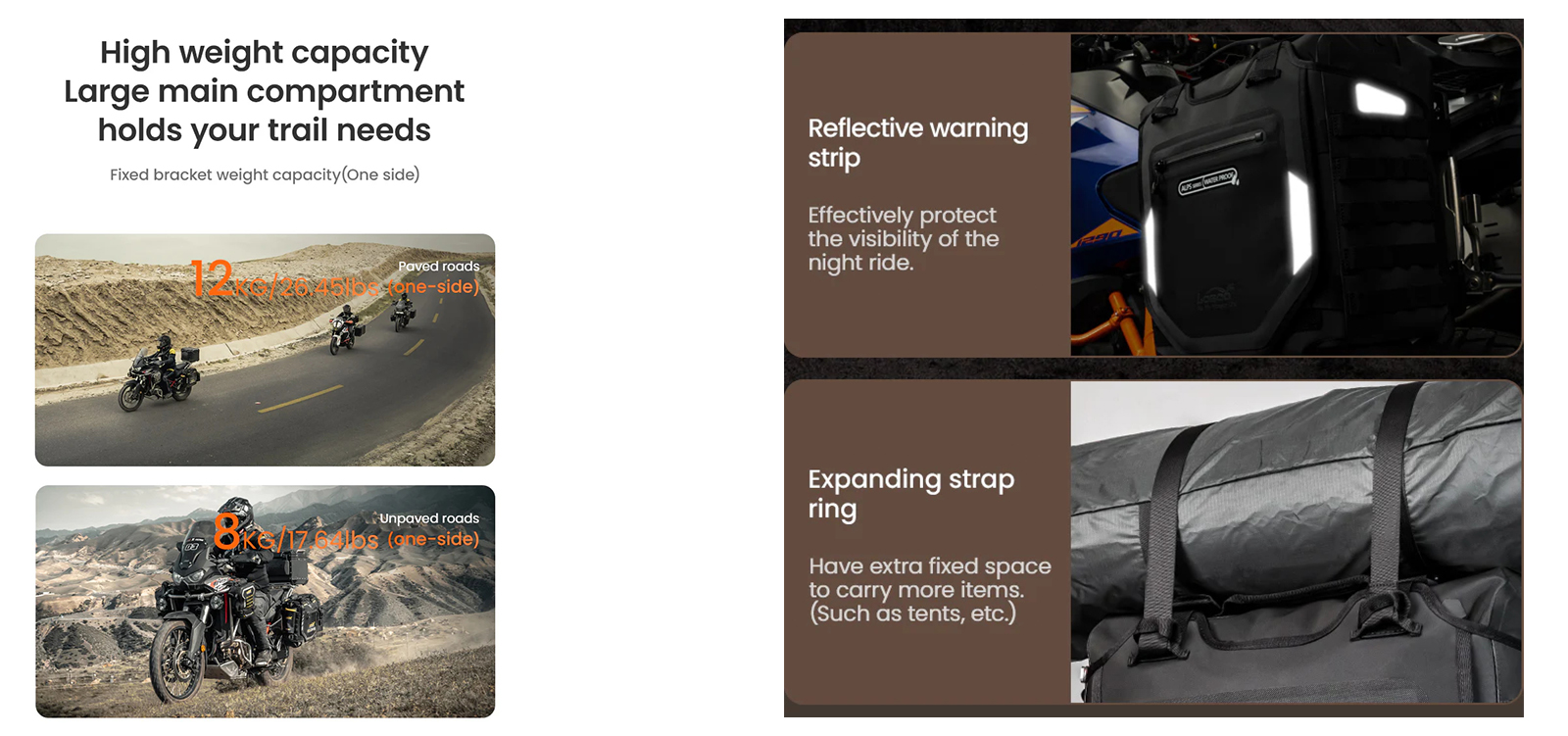 • Single Bag Load Capacity: Designed to carry up to 12KG on roads and 8KG off-road, ensuring reliability across various terrains.