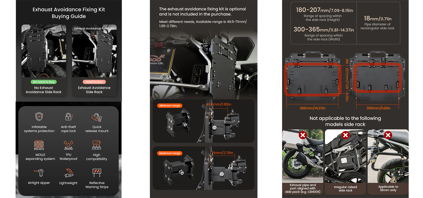 (Note: This product is not compatible with motorcycles where the exhaust contacts the bag, such as Honda CB400X and Honda CB500X.)