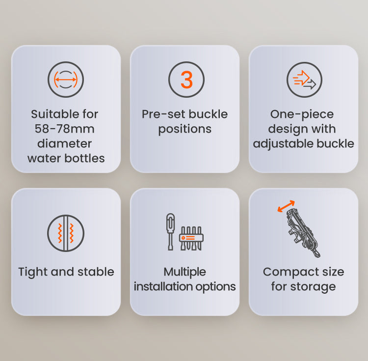 • Quick loading and unloading: With 3 preset buckle positions and preferred elastic ropes, it can achieve fast loading and unloading of 2.28-3.07 inch diameter water bottles. The operation is simple, and users can easily complete the loading and unloading of water bottles.