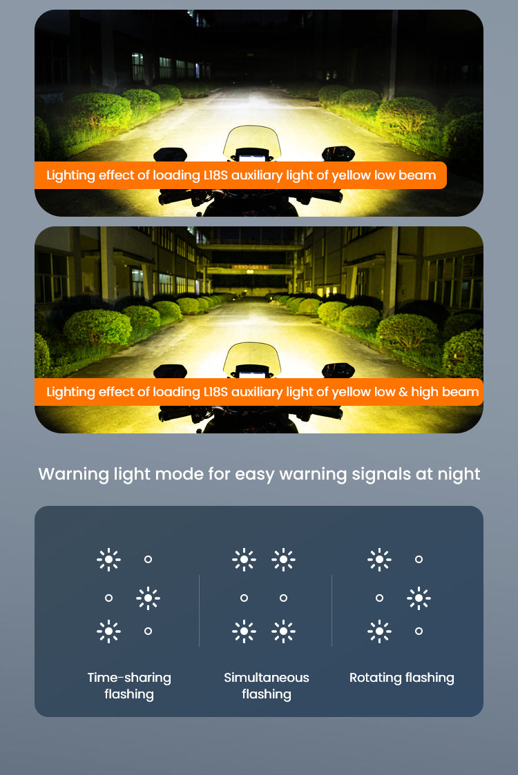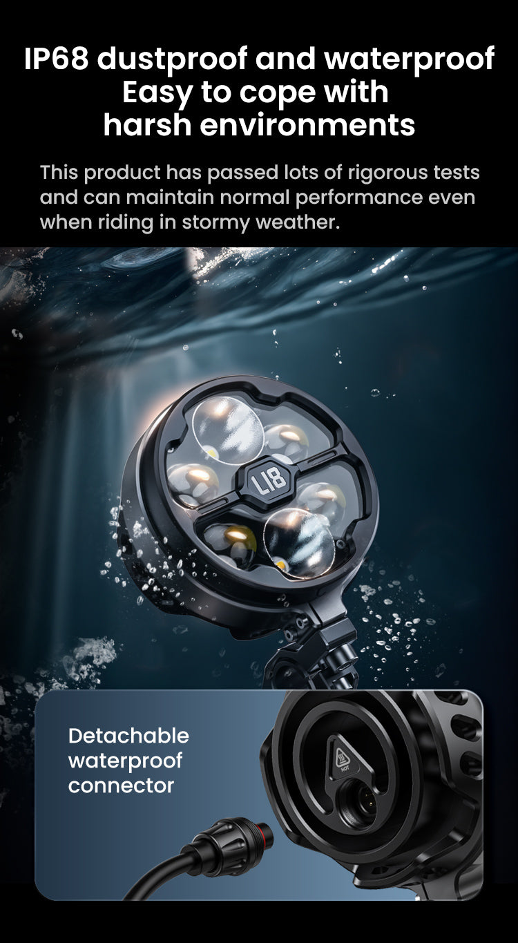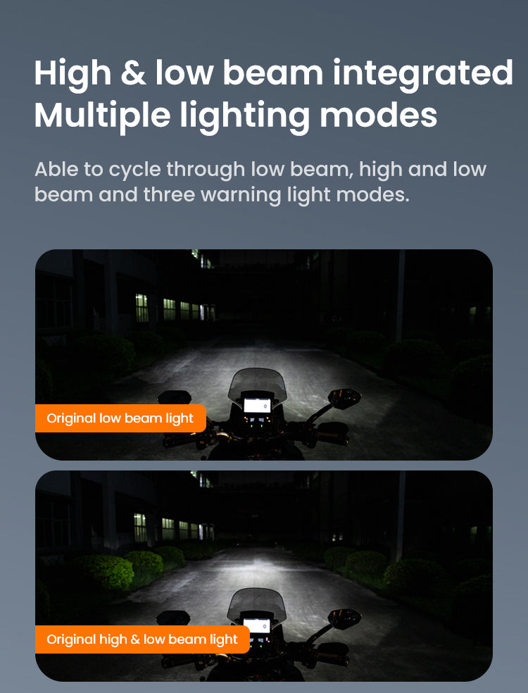 Multiple lighting modes: To cope with different complex riding environments, achieve cyclic switching of low beam, high and low beam, and three warning light modes, providing more choices.