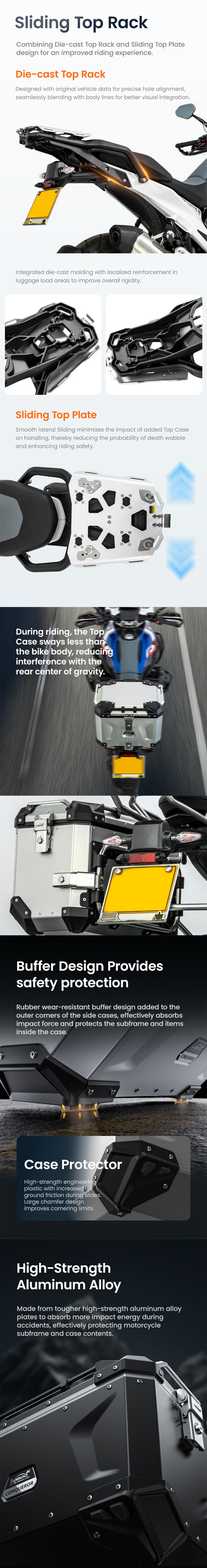 • Safety Quick-Release System: Features a secure, quick-release mounting system that allows you to attach or detach the cases in seconds while maintaining stability during aggressive riding.