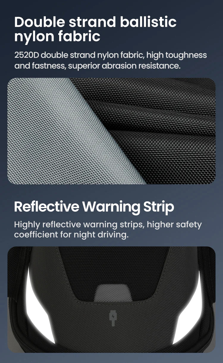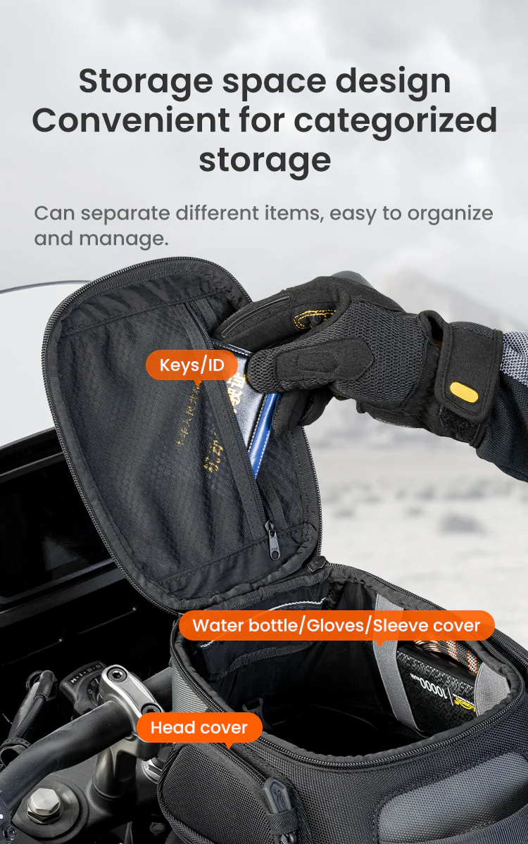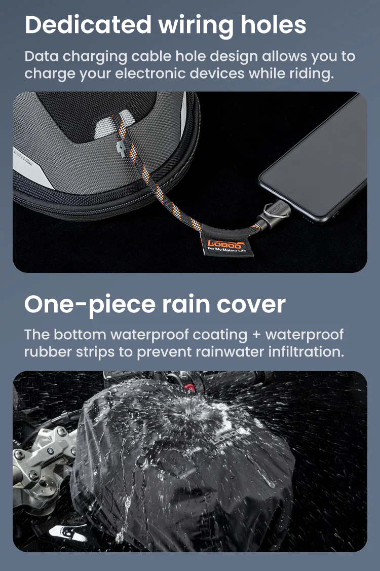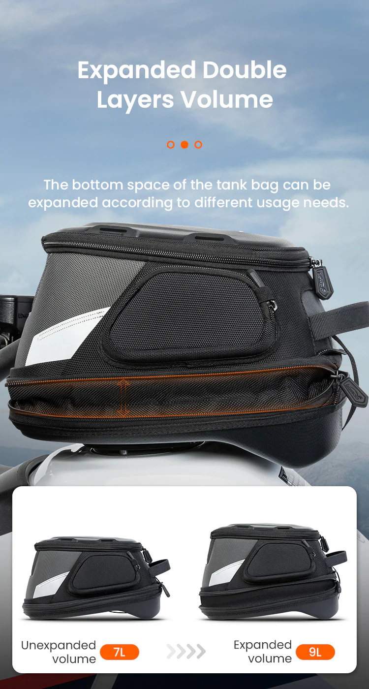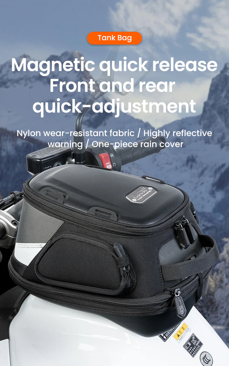 Tank Bag:Magnetic quick release Front and rear quick-adjustment,Nylon wear-resistant fabric /Highly reflective warning/ One-piece rain cover