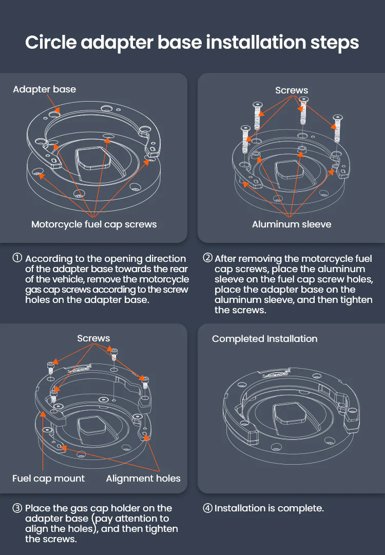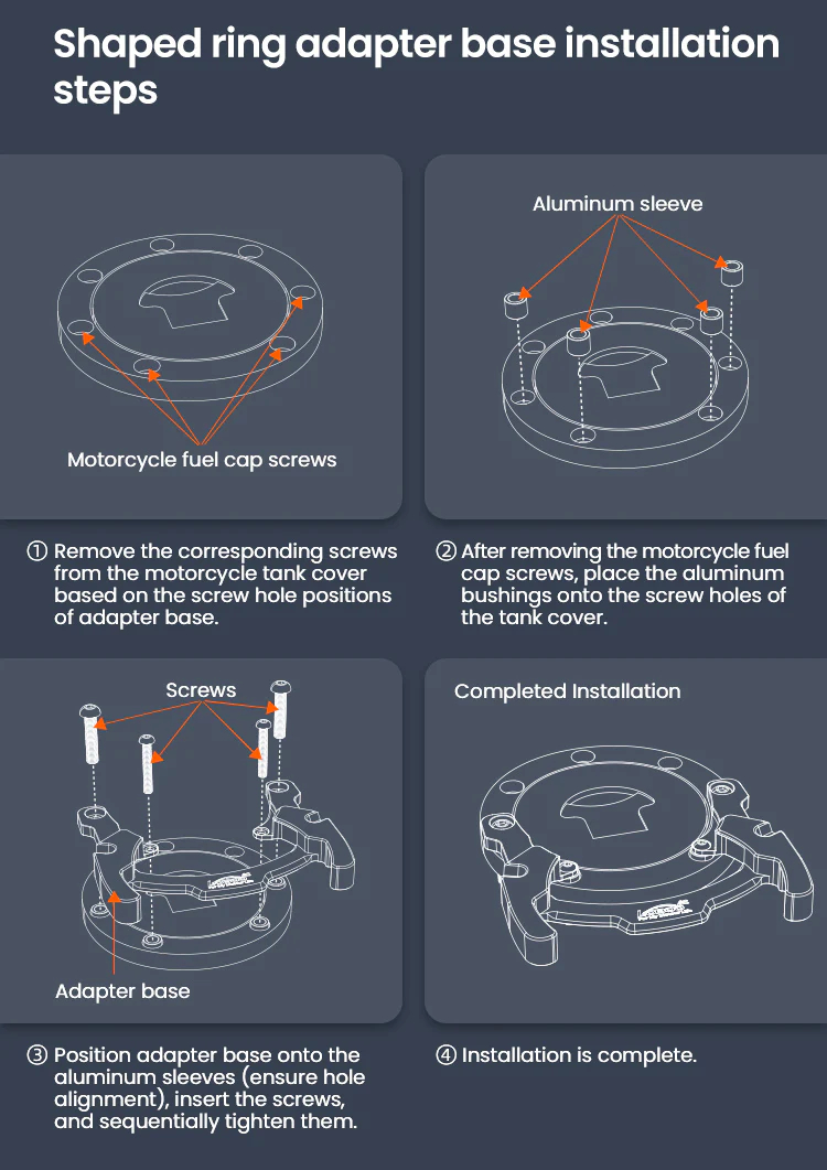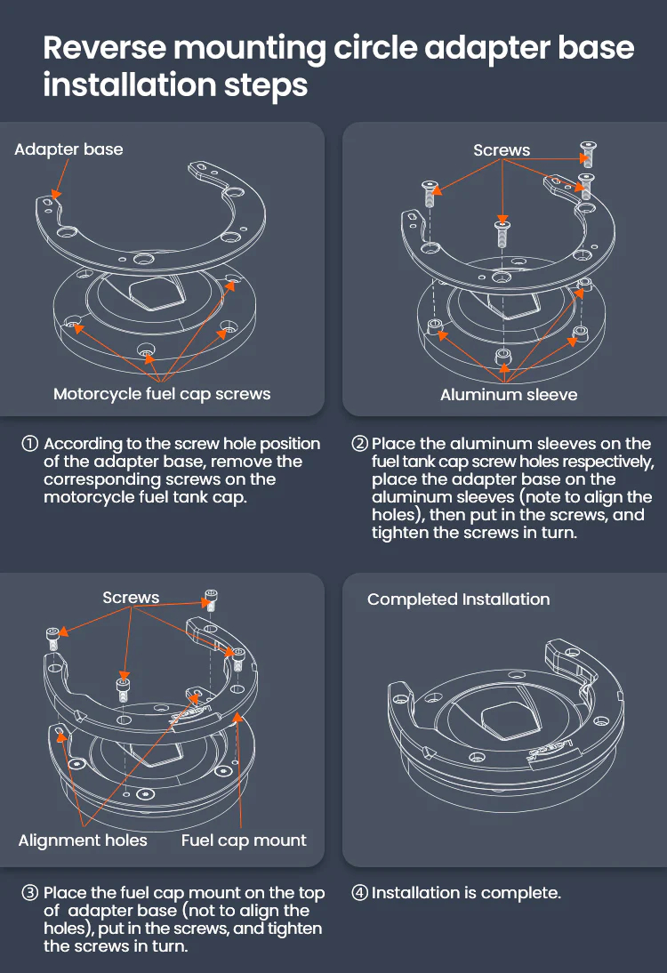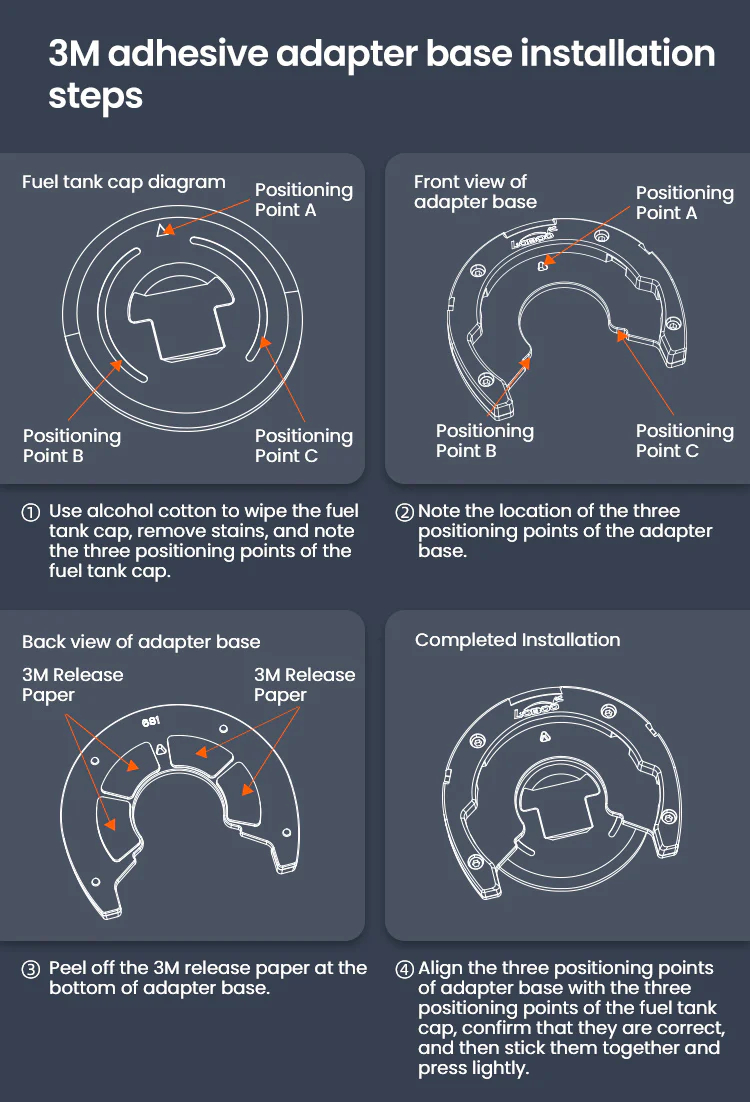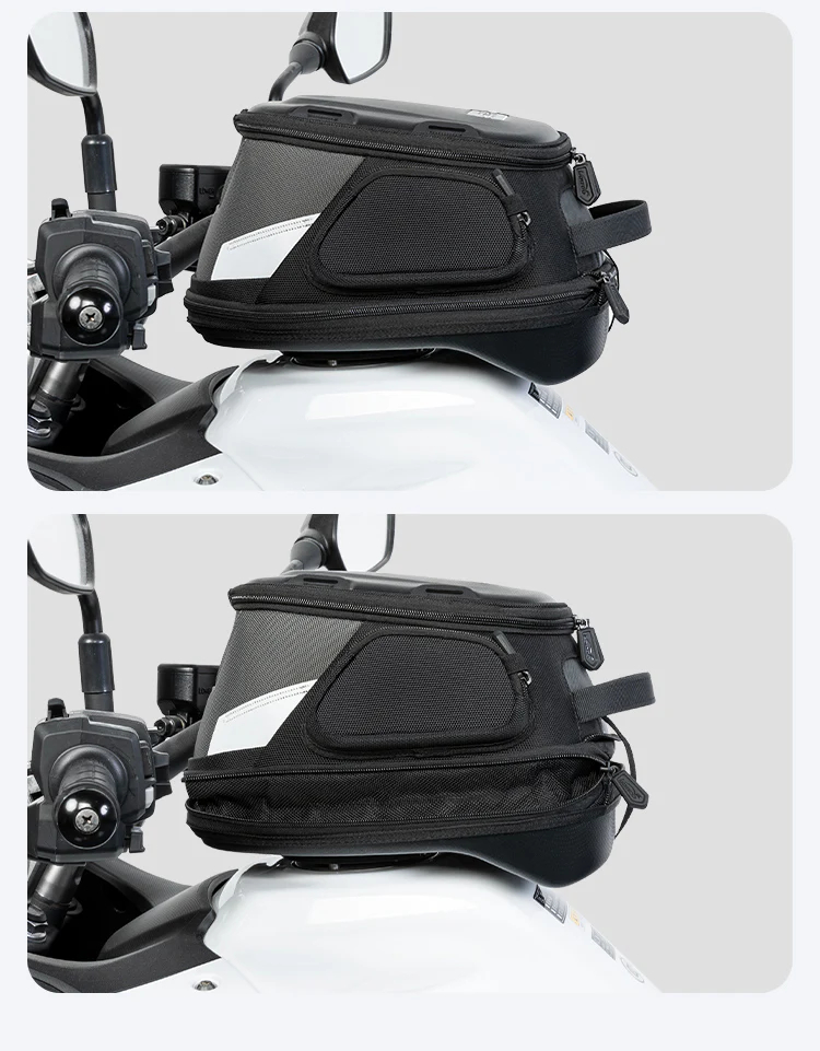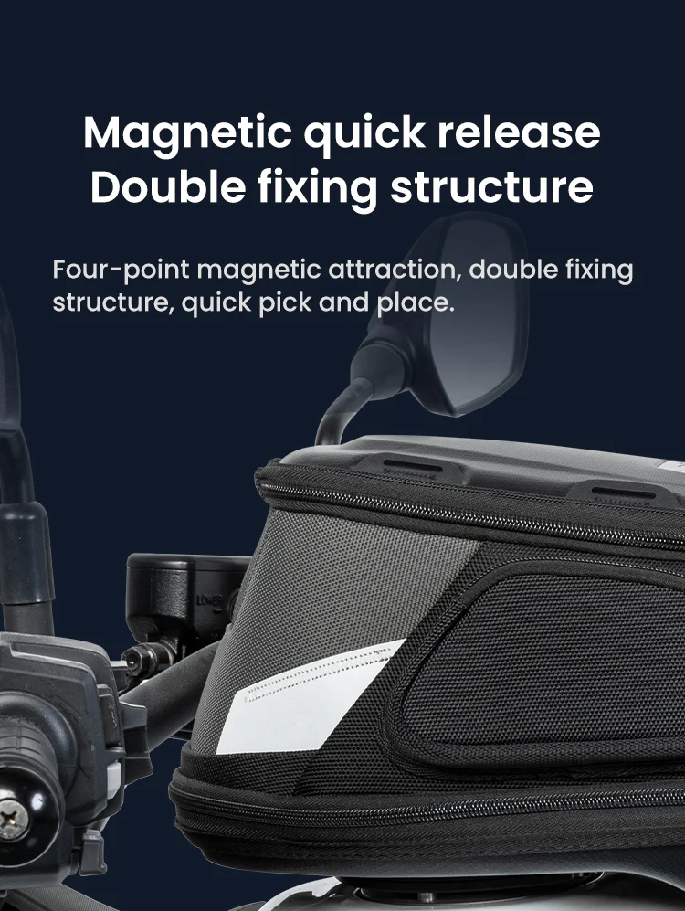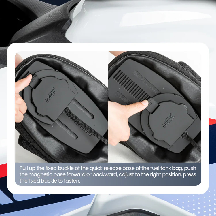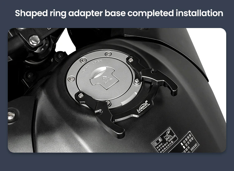 Magnetic quick release Double fixing structure,Four-point magnetic attraction, double fixing structure, quick pick and place.Quick disassembly and non-contact with the paint surface of the fuel tank will not damage the paint surface
