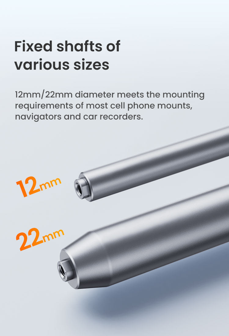 Fixed shafts of various sizes:12mm/22mm diameter meets the mounting requirements of most cell phone mounts,navigators and car recorders.