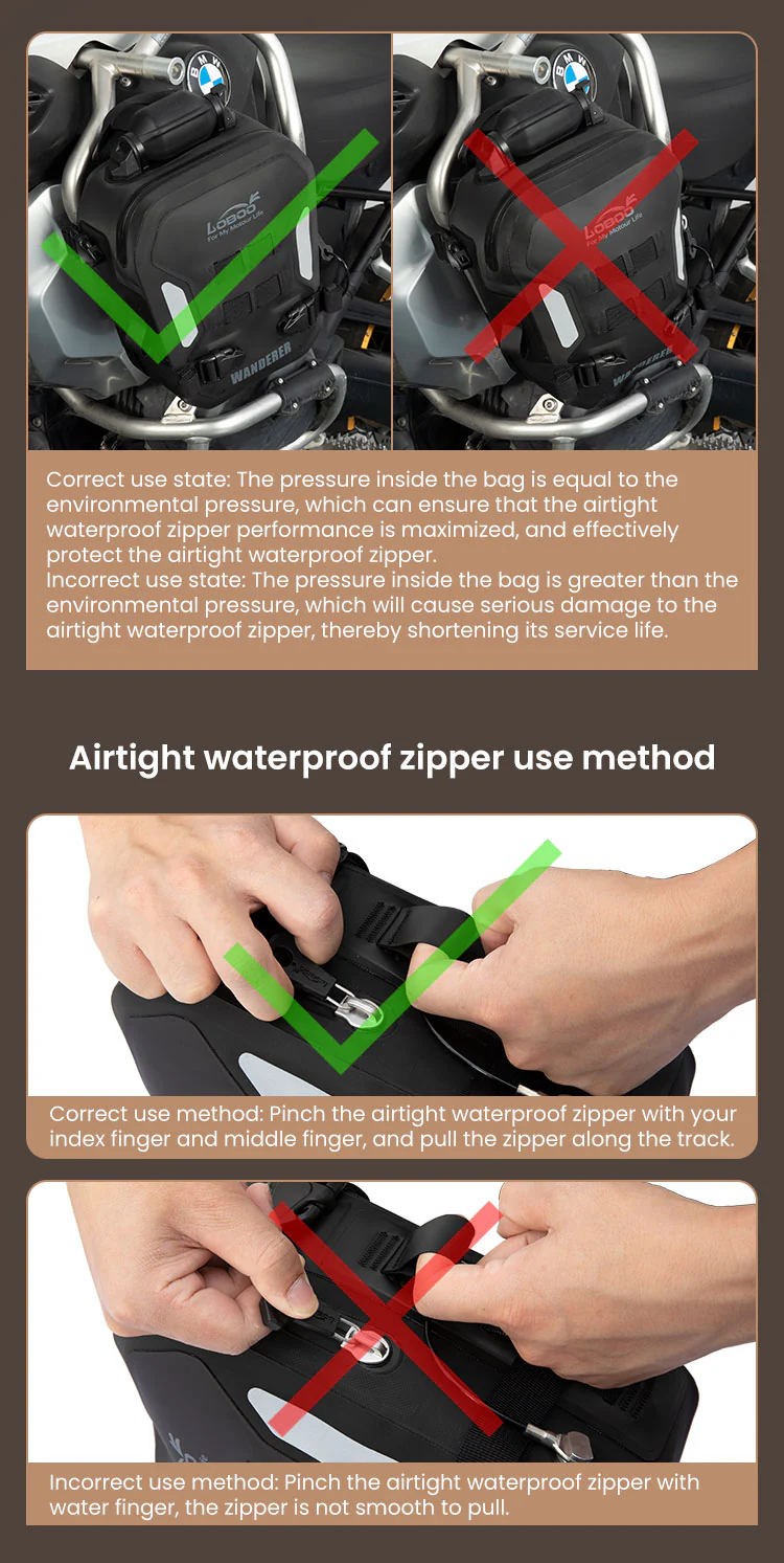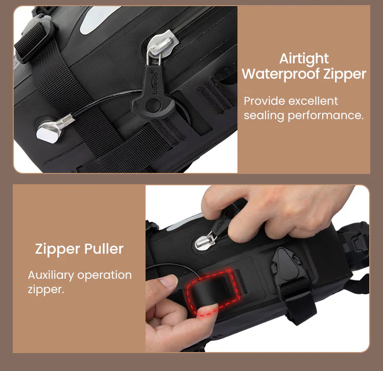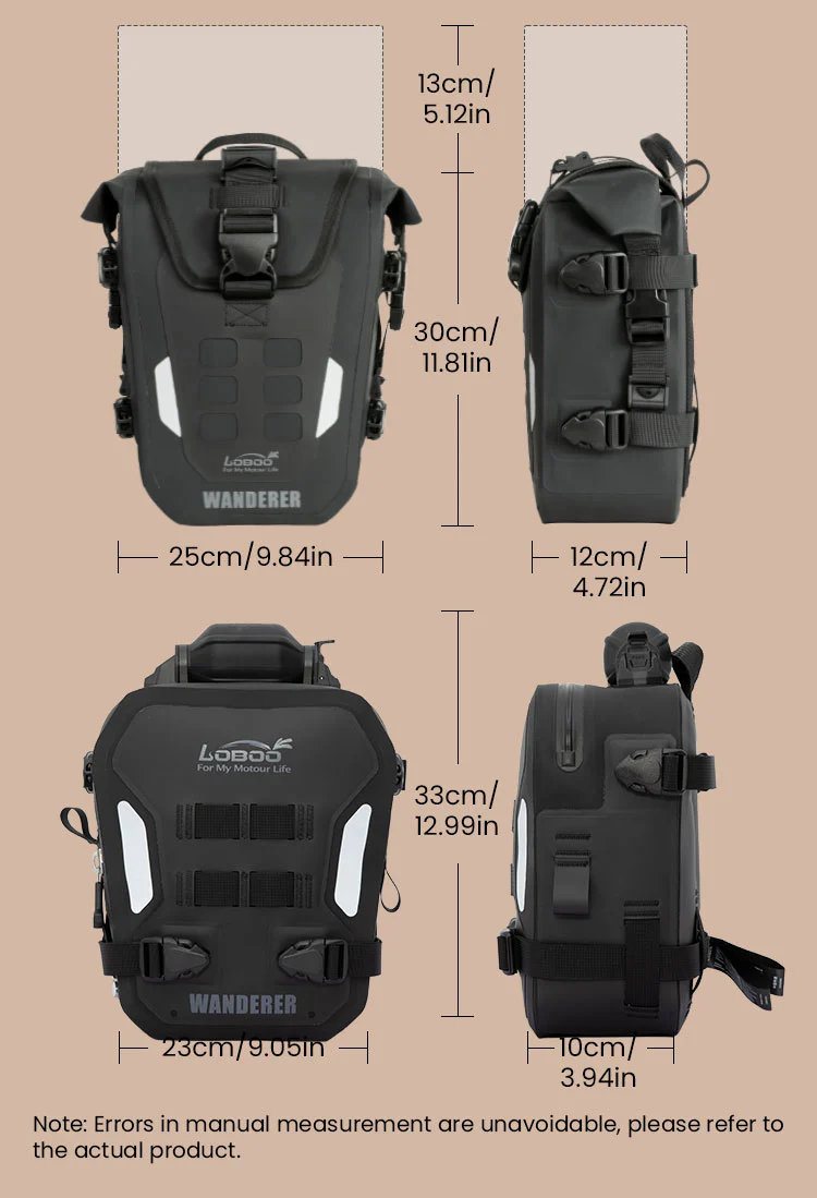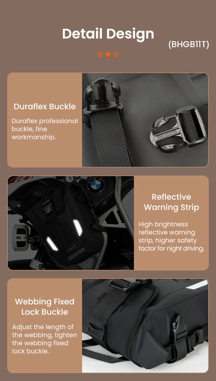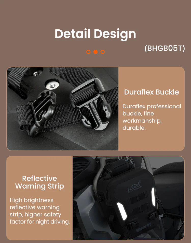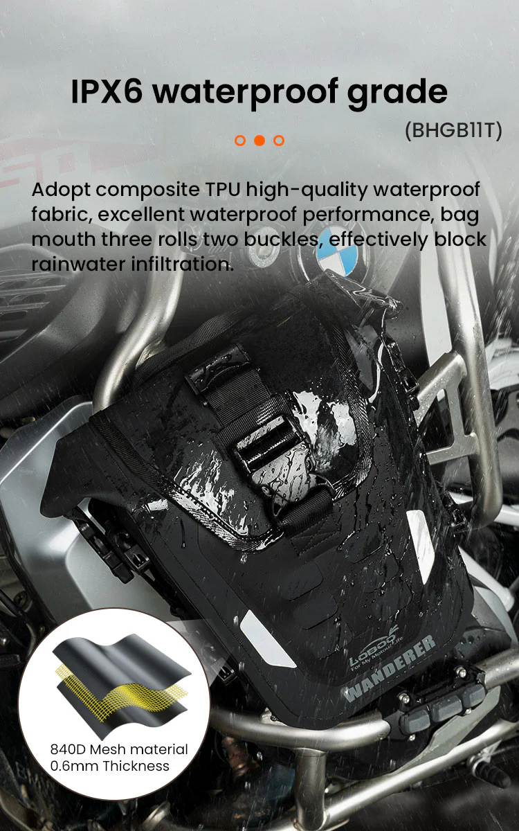 Constructed from premium TPU composite fabric, the Wanderer Crash Bar Bags feature IPX6 waterproofing, effectively preventing rainwater infiltration. This ensures your items stay dry and protected, even in heavy downpours or wet environments.