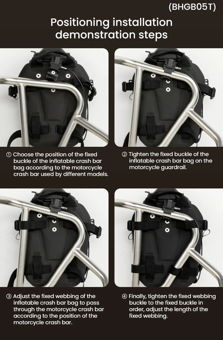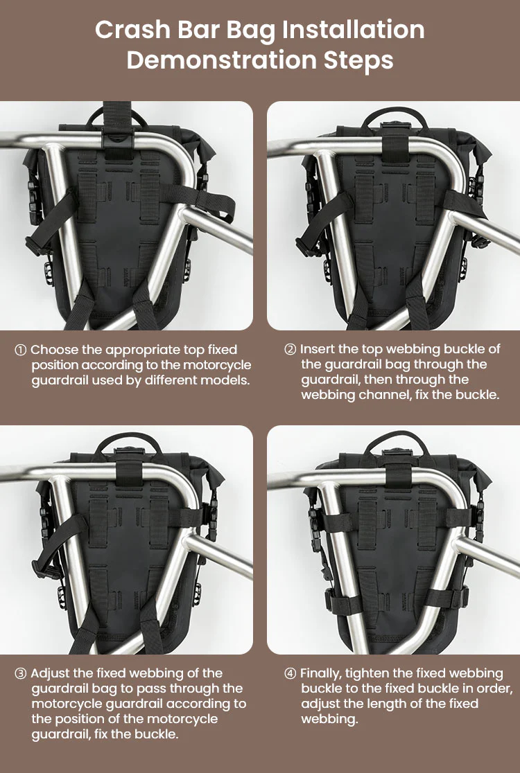 The adjustable strap fixing buckles and universal mount design accommodate 25mm crash bar diameters, ensuring compatibility with a wide range of motorcycles. The intuitive installation process, complemented by lightweight yet sturdy materials, makes these bags an indispensable addition for riders seeking convenience and style. Strap one or more of the motorcycle frame bag directly to your bike and use it as a front bag, dirt bike bag, tail bag, crash bar bag or sissy bar bag for your daily adventures.