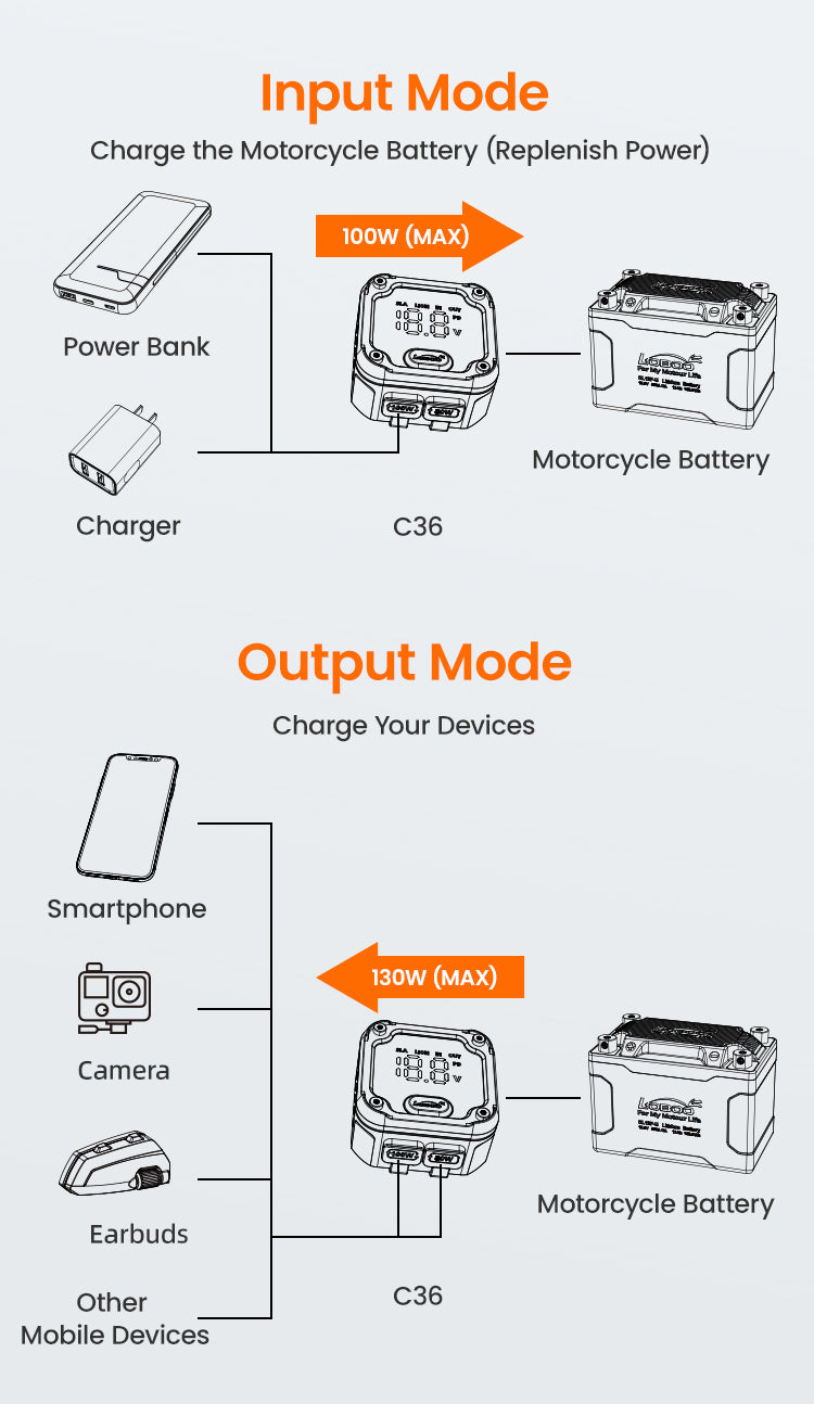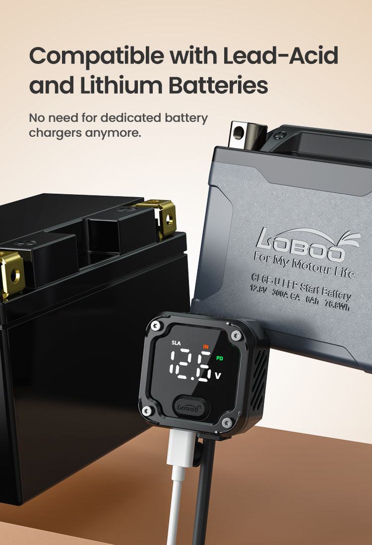 Can charge motorcycle batteries by phone, pad or computer chargers